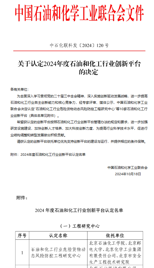 我校牵头申报的“石油和化工行业危险货物动态风险防控工程研究中心”获批中国石油和化学工业联合会石油和化工行业创新平台