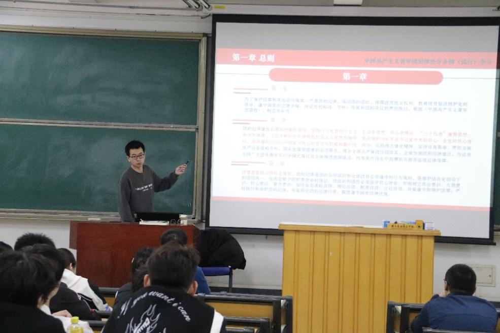 郑鹏宇老师带领大家集体学习《中国共产主义青年团纪律处分条例(试行)》。他介绍了条例制定的背景和目的,强调团内纪律是维护团组织纯洁性和战斗力的关键。郑老师对条例逐条解读,同学们积极思考核心要求,相互开展交流讨论,深化对条例的理解。