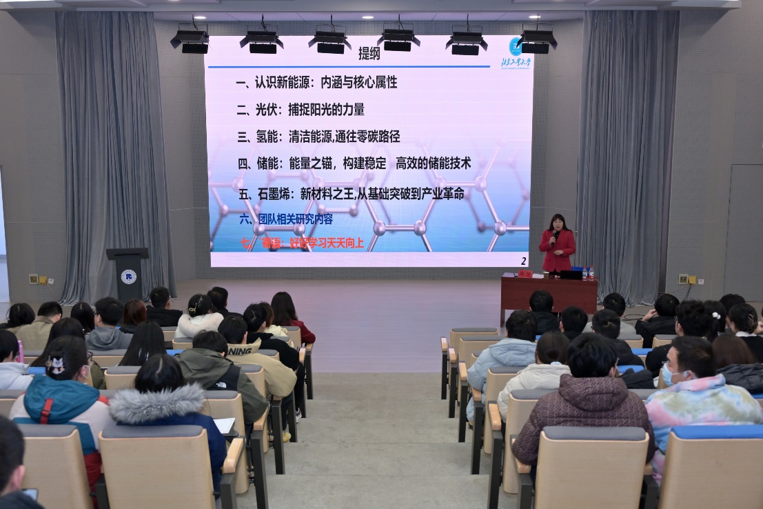 唐教授结合构建新能源创新体系,聚焦石墨烯材料特性及产业化进展,介绍了石墨烯可赋能柔性电子、秒充储能设备等特性,讲解了石墨烯在新能源领域提升锂电池性能、助力太阳能电池与氢能技术突破的基本原理。唐教授还以图文视频形式分享了其研究团队在先进碳基材料、高分辨场发射电子源及大容量储能器件方向的核心突破,介绍了创制新型快速充放电储能元器件以及开发稀土类量子效应冷场发射电子源的攻关历程和研究成果。唐教授在报告最后勉励北石化学子要创新进取、持之以恒、不懈努力、坚忍不拔,坚持以好学成才、以本领立业、以担当成事,在时代浪潮中校准坐标,把青春挥洒在强国建设的新征程中。
