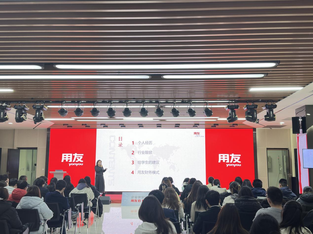 在随后的专家分享会上,用友网络FSSC总监王斯卉对师生的到来表示热烈欢迎,并以 “企业数智化浪潮下的人才能力重塑”为主题展开深度分享。她结合自身丰富的行业经验,深入浅出地剖析了当前财务领域的变革趋势,明确了未来职场对财务人才的核心要求——不仅需要扎实的专业理论功底,更要具备跨领域知识整合能力、实战操作经验、创新思维及快速学习能力。她强调,数智化时代,既懂财务专业、又通业务逻辑、善用技术工具的复合型人才将成为行业“刚需”,鼓励ACCA学子们在深耕专业知识的同时,主动拥抱技术变革,提前布局职业能力储备。