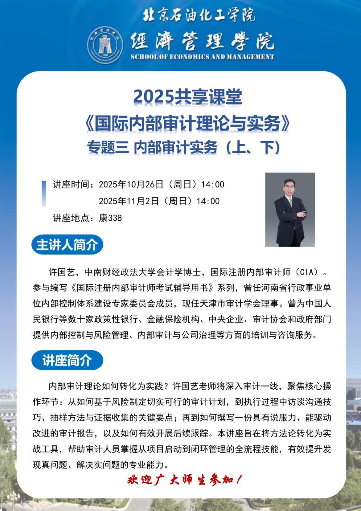 讲座通知:2025共享课堂 《国际内部审计实务》专题三 内部审计实务(上、下)