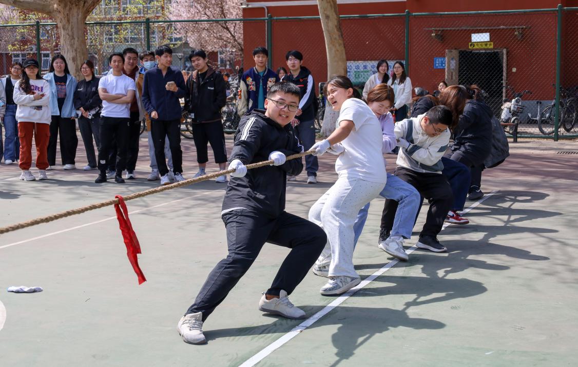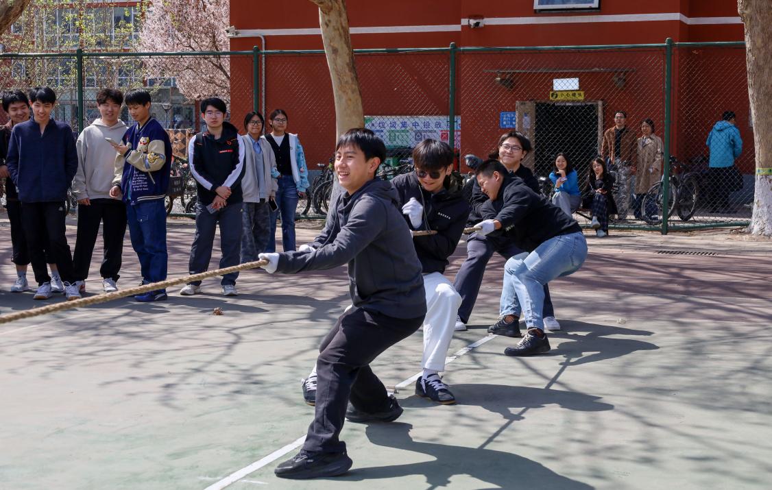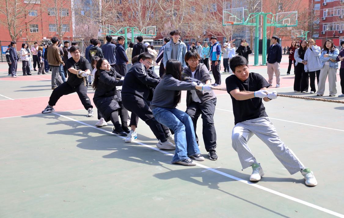 比赛异常激烈。队员们精神抖擞、整装待发,双手紧握粗粝麻绳,身体后倾、重心下沉,肌肉紧绷间尽显昂扬斗志。随着哨声响起,双方队员瞬间发力,每一次奋力拉扯都凝聚着团队的力量,每一声咬牙坚持都彰显着不服输的韧劲,让在场观众屏息凝神、心随绳动。围观同学早已围得里三层外三层,目光紧紧锁定赛场,被选手们的执着与热忱深深感染。