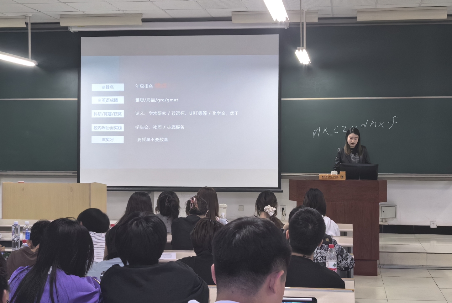 朱瑞宇同学以如何进行考研备考为主题,针对考研择校、备考规划、时间安排和复习计划和复试经验进行了细致的介绍,并为同学们推荐了不同科目的复习资料,鼓励大家结成考研对子相关鼓励,坚持度过倦怠期保持良好心态。