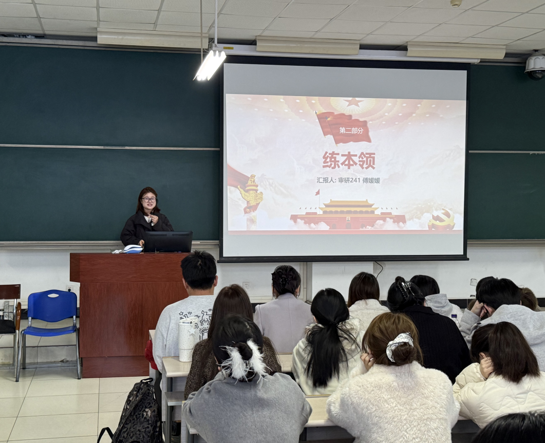 2026年3月19日上午,经济管理学院学生第七党支部、学生第八党支部(研究生党支部)于康409如期举行第三十二期“工研论坛”。本期论坛由商研241李园园、审研241傅媛媛和审研241韩婧茹主讲,经济管理学院学生第七党支部书记张丽老师出席此次论坛,经济管理学院全体研究生同学参加了论坛。