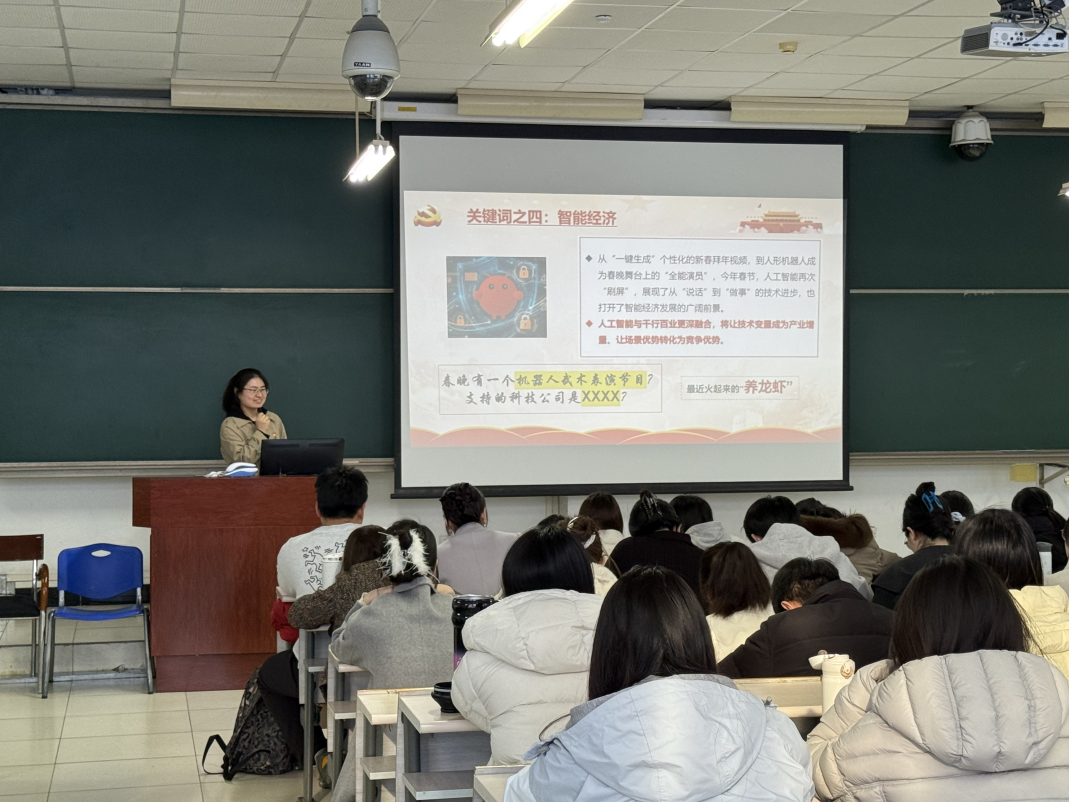 第三环节“展未来”由韩婧茹同学主讲。她结合两会提出的“一体推进教育科技人才改革”战略,阐述了新时代研究生应如何将个人理想融入国家发展。