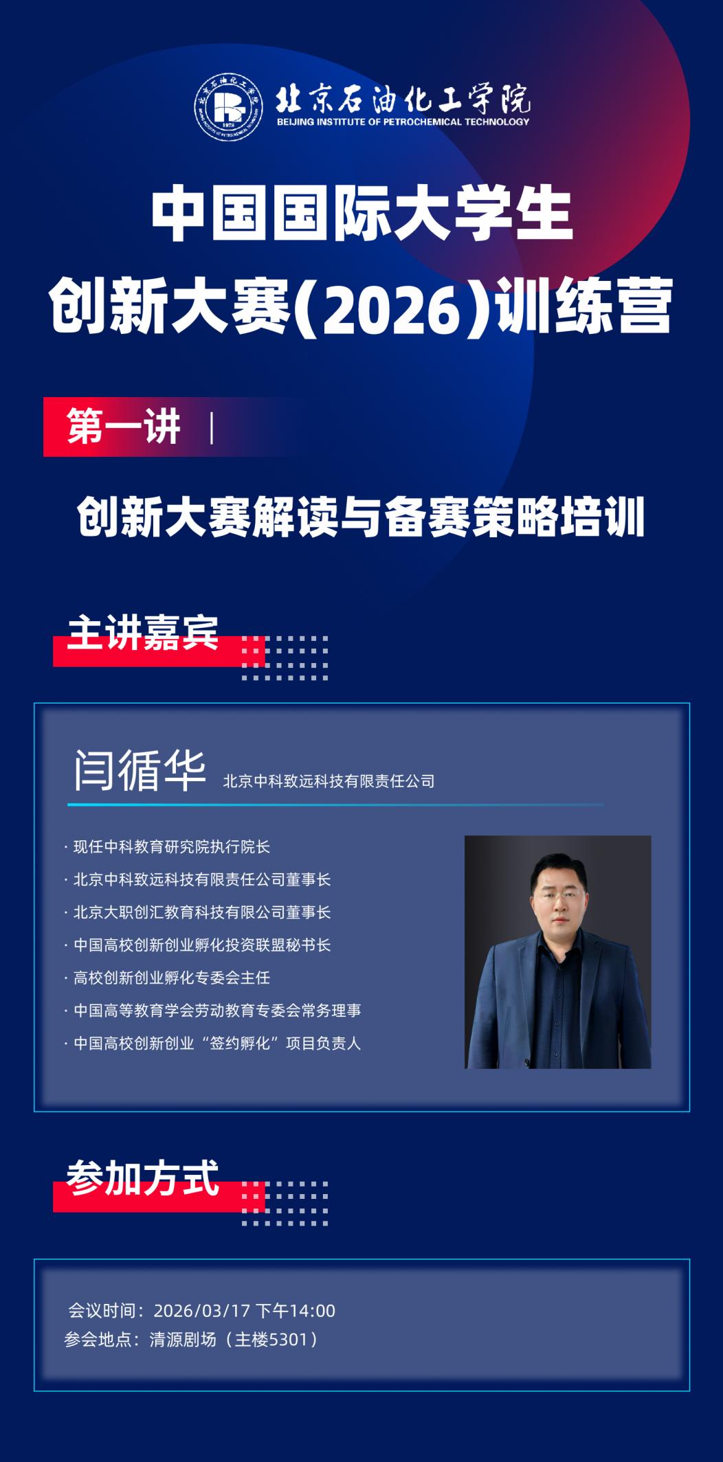 为深入贯彻落实习近平总书记关于教育的重要论述和给中国国际大学生创新大赛参赛学生代表的回信精神,落实《国务院办公厅关于深化高等学校创新创业教育改革的实施意见》《国务院办公厅关于进一步支持大学生创新创业的指导意见》等文件精神,全面深化我校创新创业教育改革、提升大学生创新创业能力、加快培养创新创业人才。现组织开展北京石油化工学院中国国际大学生创新大赛(2026)训练营第一讲:创新大赛解读与备赛策略培训,助力师生更好的备赛,现将有关培训安排通知如下: