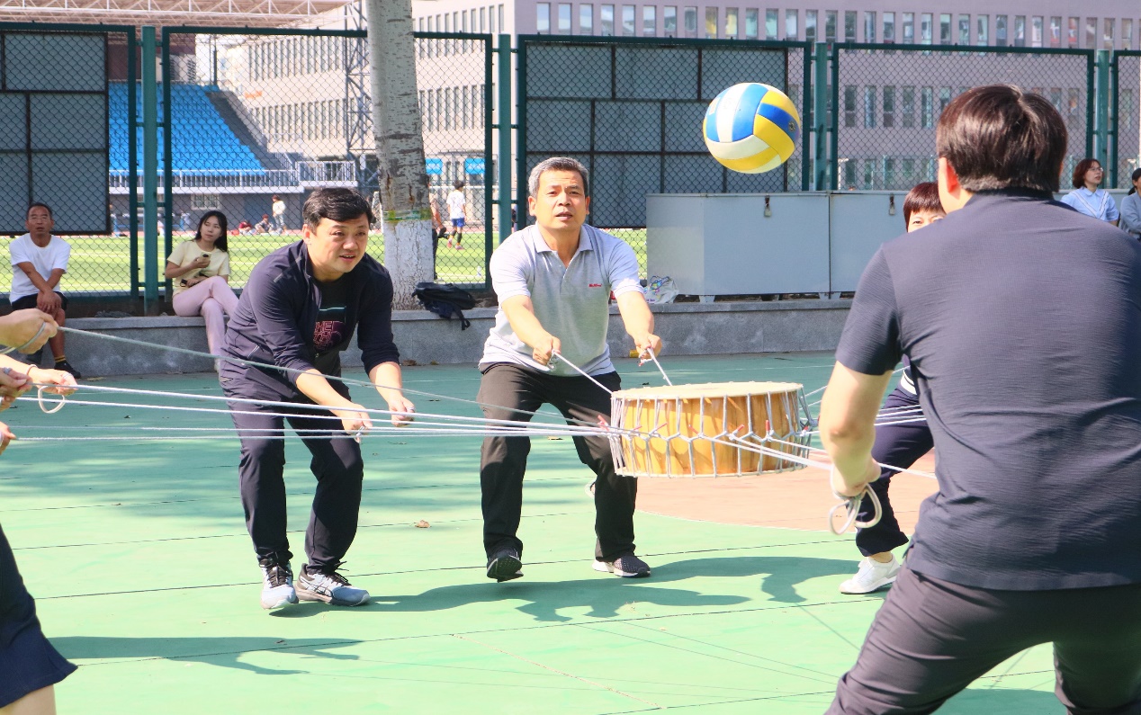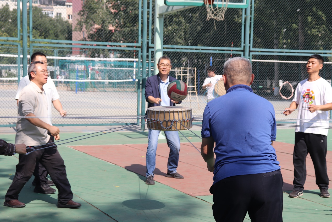 活动当天,5支基层组织代表队首先集结,赛场周围很快被热烈的氛围包裹。作为集体项目的核心——“同心鼓” 比拼环节将现场气氛推向小高潮。平日里专注于教学、科研的老师们瞬间切换 “队友模式”,每支队伍8人围站成圈,双手紧握鼓边绳索,目光紧紧锁定鼓面中央的排球。大家根据球的弹跳节奏调整拉绳力度,有人负责喊节拍把控节奏,有人紧盯球体提醒队友微调方向。比赛现场的鼓面与排球碰撞的 “咚咚” 声、老师们的呐喊声与场边观众的欢呼声交织在一起。平时在各自办公室忙工作的老师们,通过同心鼓比赛,找到了配合的默契和快乐团队的距离无形中被拉近。