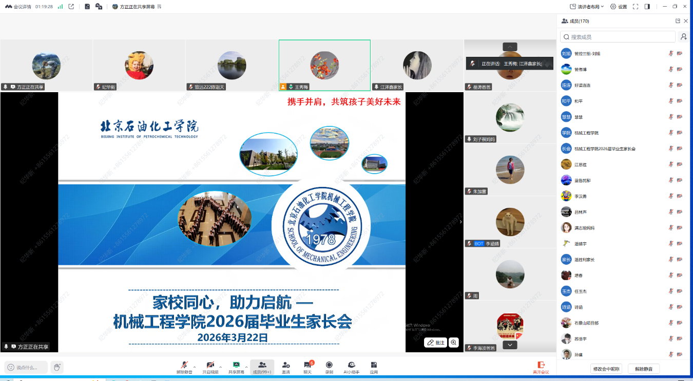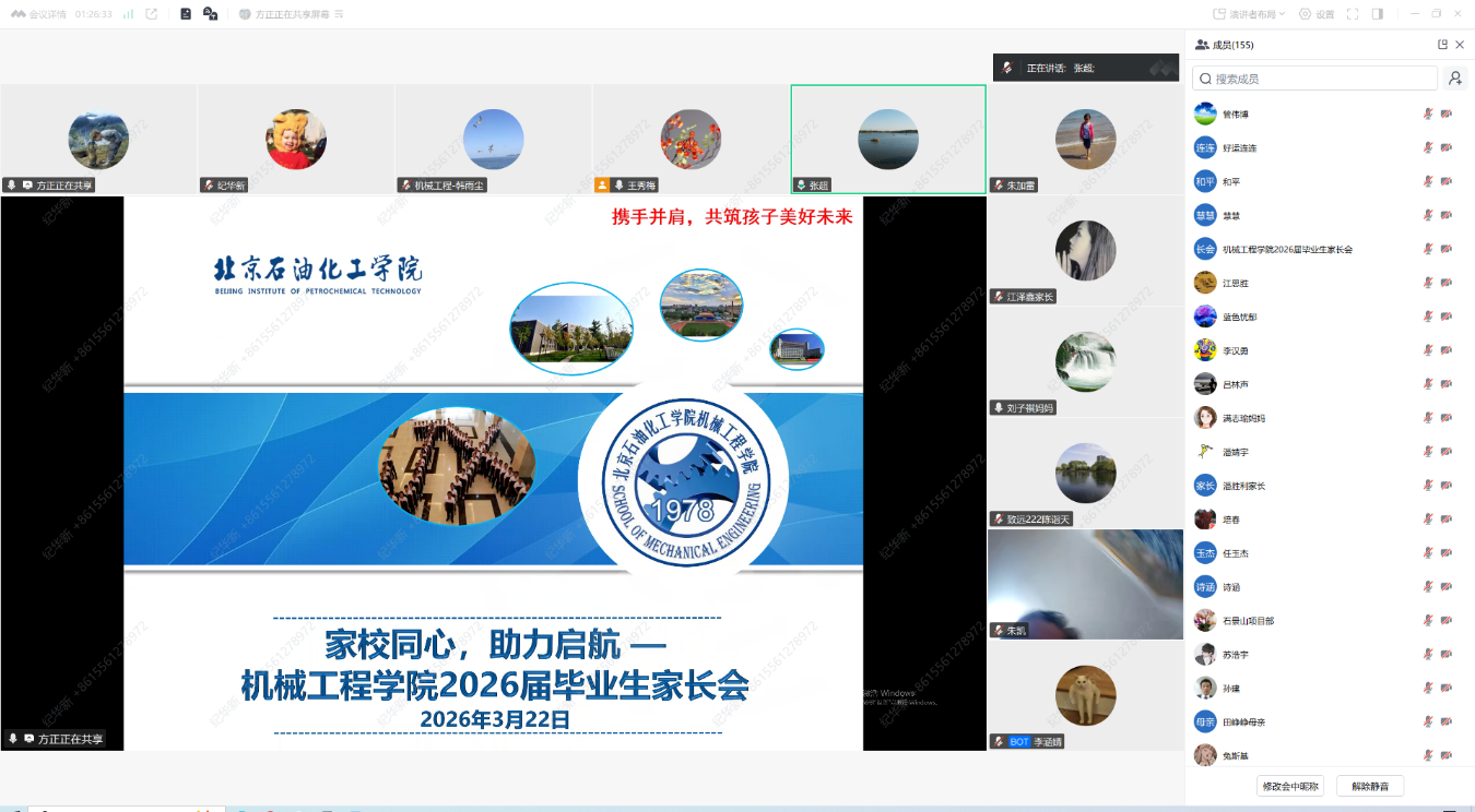 为进一步畅通家校沟通渠道,凝聚家校育人合力,解读就业政策,帮助毕业生明确就业方向,切实做好毕业生就业促进工作,3月22日20:00,机械工程学院线上召开2026届全体毕业生家长会。学院党委书记张超、院长朱加雷、副院长王亚飞、党委副书记王秀梅、2026届全体班主任、就业辅导员方正及2026届毕业生家长参会,共话毕业生成长与就业,共筑育人同心圆。