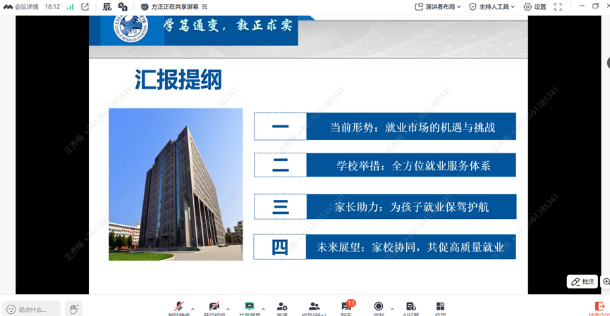 方正老师围绕2026届毕业生就业工作进行了详细讲解,重点解读了当前高校毕业生就业形势、各项就业扶持政策及学院后续就业推进计划,呼吁家长主动支持孩子,积极就业,抢抓机会,希望家校双方协同发力、凝聚合力,共同推动毕业生实现高质量就业。