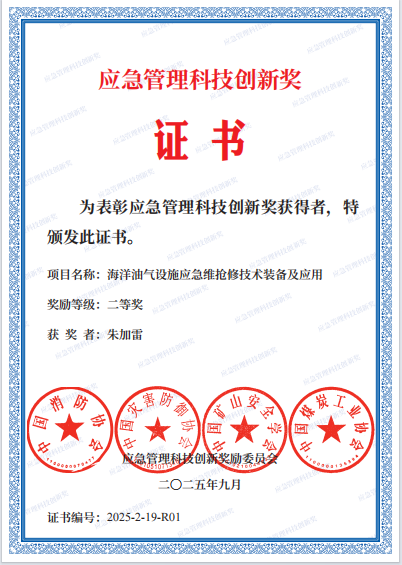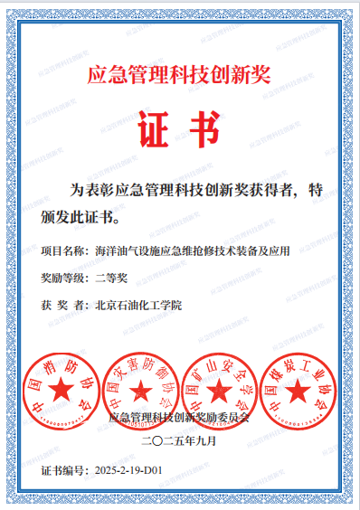近日,2025年度应急管理科技创新奖评选结果正式揭晓,朱加雷教授、高辉教授牵头完成的“海洋油气设施应急维抢修技术装备及应用”项目荣获二等奖,这是团队2025年继机械工业科学技术二等奖之后获得的又一重要奖项,也是对我校在海洋能源安全保障和水下应急维修领域长期积累科技成果的高度认可。