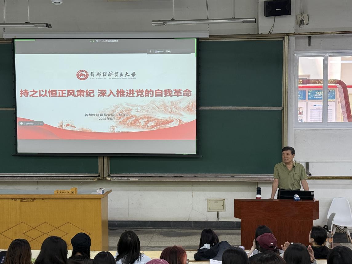 为深入学习习近平总书记关于党的建设的重要思想,坚持党要管党、全面从严治党,引导师生准确把握中央八项规定精神。2025年6月3日,特邀首都经济贸易大学原党委常委纪委书记、工会教代会主席赵凤启教授,以“持之以恒正风肃纪,深入推进党的自我革命”为题,为全校师生带来一场兼具学术深度与现实意义的讲座,活动采取线上线下同步直播形式,吸引千余名师生参与学习。本次讲座由北京石油化工学院习近平新时代中国特色社会主义思想学习研究中心主办、马克思主义学院承办,系“思政名家论坛”学术交流活动暨“形势与政策”系列专题讲座。