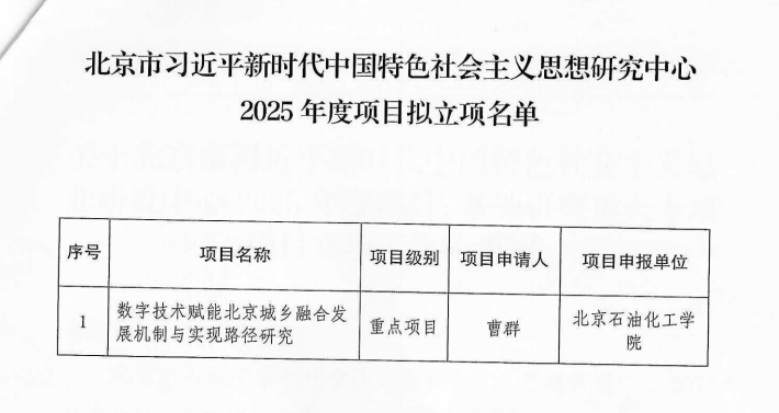 近日,我校马克思主义学院曹群教授申报的“数字技术赋能北京城乡融合发展机制与实现路径研究”(项目编号:25LLYJB076),成功获批北京市习近平新时代中国特色社会主义思想研究中心2025年度重点项目。此次立项也是我校在该项目领域的首次突破。