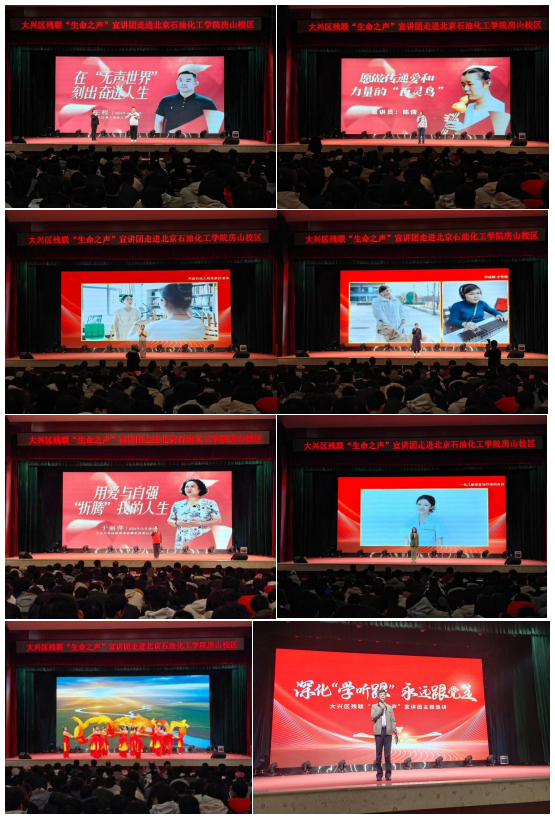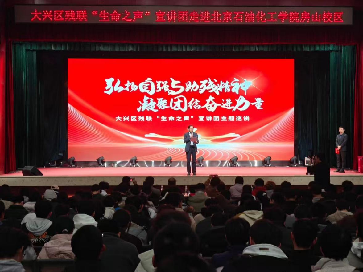 2025年11月11日,由我校马克思主义学院参与承办的大兴区残联“生命之声”宣讲团进校园活动在房山校区成功举行。本次活动以“弘扬自强与助残精神,凝聚团结奋进力量”为主题,通过宣讲团成员感人至深的生命故事,为我校师生带来了一堂生动而深刻的思政课。大兴区残联理事长牟育著,副校长张泉利,马克思主义学院直属党支部书记刘颖、副院长黄小惠、思政课教师及2025级新生共千人参加了活动。