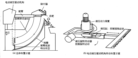 耙臂在工作循环开始或完成时,都处于图示水平位置,耙齿收缩与栅片脱开。启动时,按动开机按钮,电动液压驱动机构运作,液压马达内的压力下降,耙臂在重力作用下沿旋转轴缓慢下降,直至垂直(如图中虚线位置)。联动元件使耙臂内的双作用液压缸动作,将齿耙外伸,插入栅片间隙内,到位后液压马达启动,耙臂自下而上徐徐旋升除污;将要到达最高点时,耙齿与除污器刮渣板相交,随耙齿上升,刮渣板将栅渣外推,卸入污物盛器内,此时耙齿到达最高点,驱动液压缸,齿耙收缩复位,完成一个工作循环。