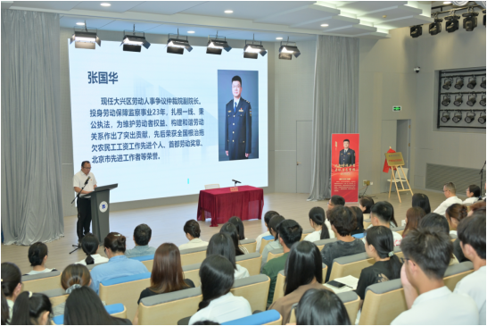签约揭牌仪式后,与会人员共同聆听“汲取榜样力量,启航青春梦想”主题宣讲,一同感受北京市先进工作者、首都劳动奖章获得者、全国根治拖欠农民工工资工作先进个人、大兴区仲裁院副院长张国华用心用情做好劳动保障监察工作的感人事迹。
