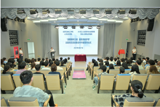 为充分发挥党建引领作用,深化校地合作、产教融合,6月27日,人文社科学院与大兴区人力社保局、劳动人事争议仲裁院举行“汲取榜样力量,启航青春梦想”主题党日活动暨合作共建签约仪式。大兴区人力社保局党组副书记、副局长、机关党委书记郑占峰,区人力社保局劳动关系党支部书记、仲裁院院长李慧茁,仲裁院副院长张国华及人力社保局劳动关系党支部党员;北京石油化工学院发展规划处处长、对外合作联络处处长何晓红,教务处处长王腾,人文社科学院党委书记王荣霞、党委副书记兼副院长郑影、副院长李思琦,以及人力资源管理系全体教师、学生党员及入党积极分子,人资系2023级本科生等140余人共同参加。