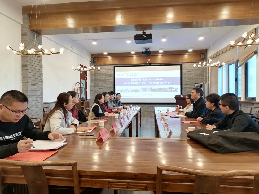 2026 年 1 月 16 日,国家大剧院台湖舞美艺术中心综合管理部副部长饶紫卿带队,马昕副部长、朱泓静、柏天一行四人到访人文社科学院,围绕校企合作、人才培养、学科专业发展开展专项调研交流。