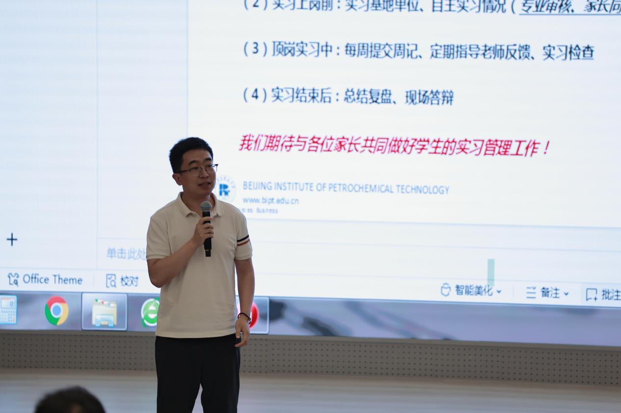 李思琦向家长详细介绍了毕业生实习工作安排,学院按照“学院统筹,专业负责,分散实习,统一管理”的工作原则,按照实习开展前、实习过程中以及实习结束后等三阶段,采取不同措施跟踪问效,扎实做好实习学生的教育管理和服务工作。