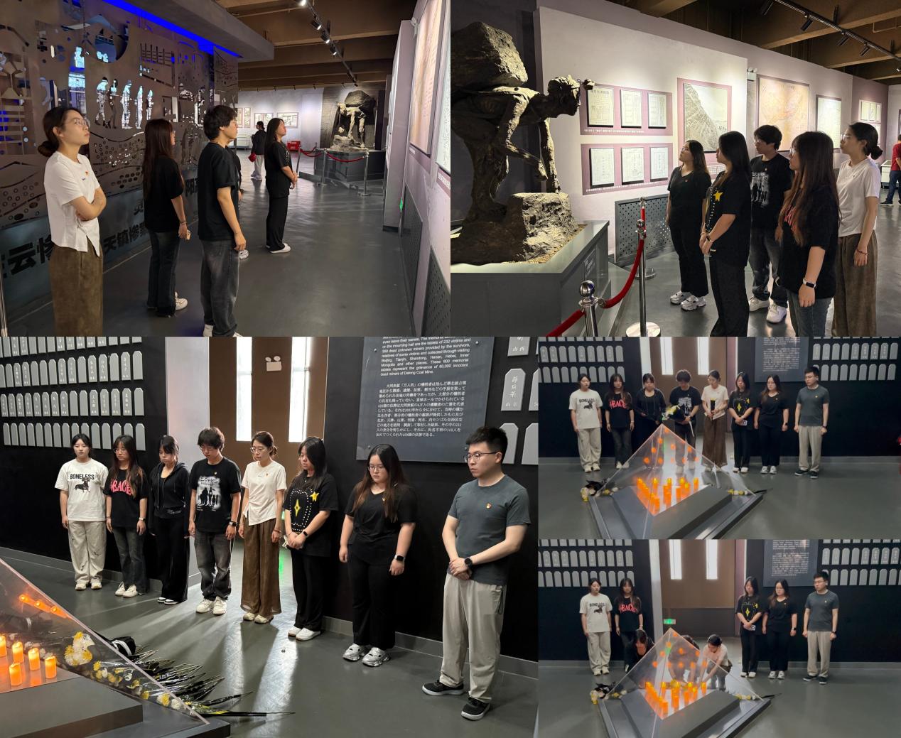 值抗战胜利80周年之际,实践团专程前往大同煤矿万人坑遗址纪念馆,接受革命文化洗礼。在“万人坑”遗址与苦难展示区,锈蚀的矿工工具、泛黄的历史照片,无声诉说着中国人民在抗日战争中的不屈抗争与巨大牺牲。面对墙上密密麻麻的英烈名字,实践团成员集体默哀,王峥老师与学生代表李天元、焦薏宁向英烈献花,深切缅怀为民族解放事业献身的先辈。