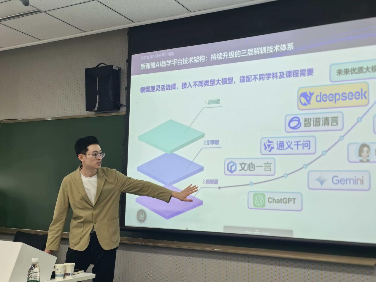 培训中,吴文汇结合真实教学场景,演示了 AI 技术在教学全流程的创新应用:课前通过 AI 工作台快速建课、智能备课,提升备课效率与质量;课中运用智能学伴、AI 讲伴、抢答统计等功能,增强课堂互动与反馈精准度;课后依托自动生成教学报告、持续答疑等机制,实现教学数据沉淀、个性化辅导与长效跟踪。