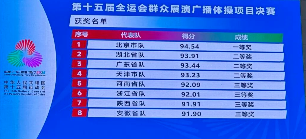 广播体操是中国人群基数最大、全国倡导普及的国民日常锻炼项目,是几代中国人共同的健身记忆,是群众体育发展的缩影,已连续两届全运会被列入群众比赛展演项目,是践行“全民全运、全运惠民”理念的重要载体。北京队在10支闯进决赛队伍中凭借整齐划一的动作、精准流畅的节奏和昂扬饱满的精神状态独占鳌头,以94.54分排名第一获得一等奖,斩获金牌。
