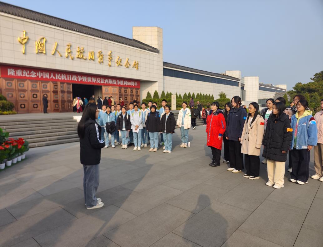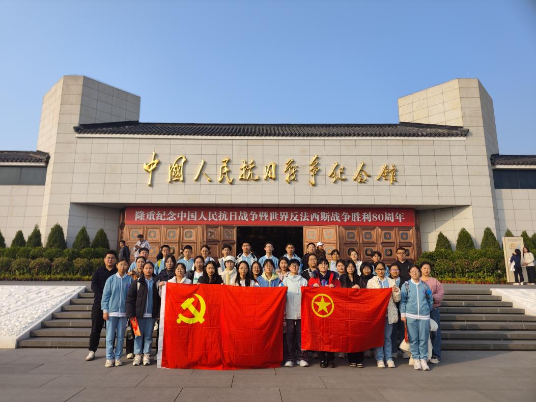 随后,队伍前往中国人民抗日战争纪念馆。在馆前广场举行了庄严的仪式教育。学生党员王琼同志作了“九三宣讲”主题分享。紧接着,全体党员重温入党誓词,全体团员重温入团誓词。最后,全体成员齐声发出“请党放心,强国有我”的青春誓言,展现了新时代青年的坚定信仰与责任担当。