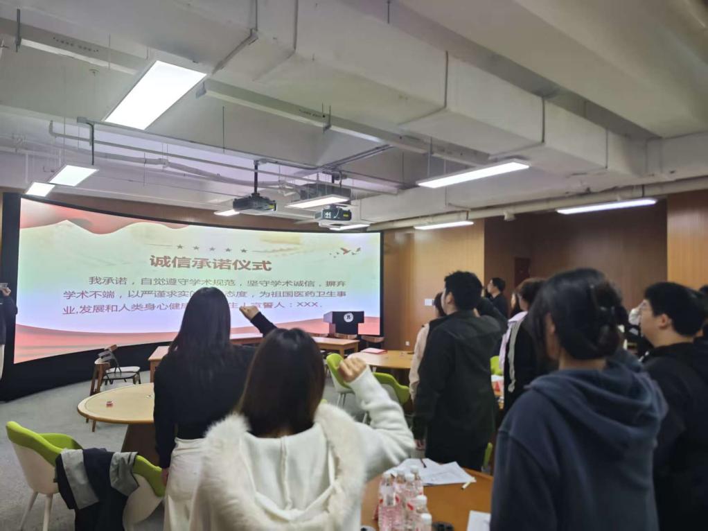 活动的高潮是全体与会党员共同参与的“科研诚信承诺仪式”。在领誓人的带领下,大家庄严宣誓,承诺恪守学术规范、捍卫科研诚信,以严谨态度服务国家医药卫生事业。