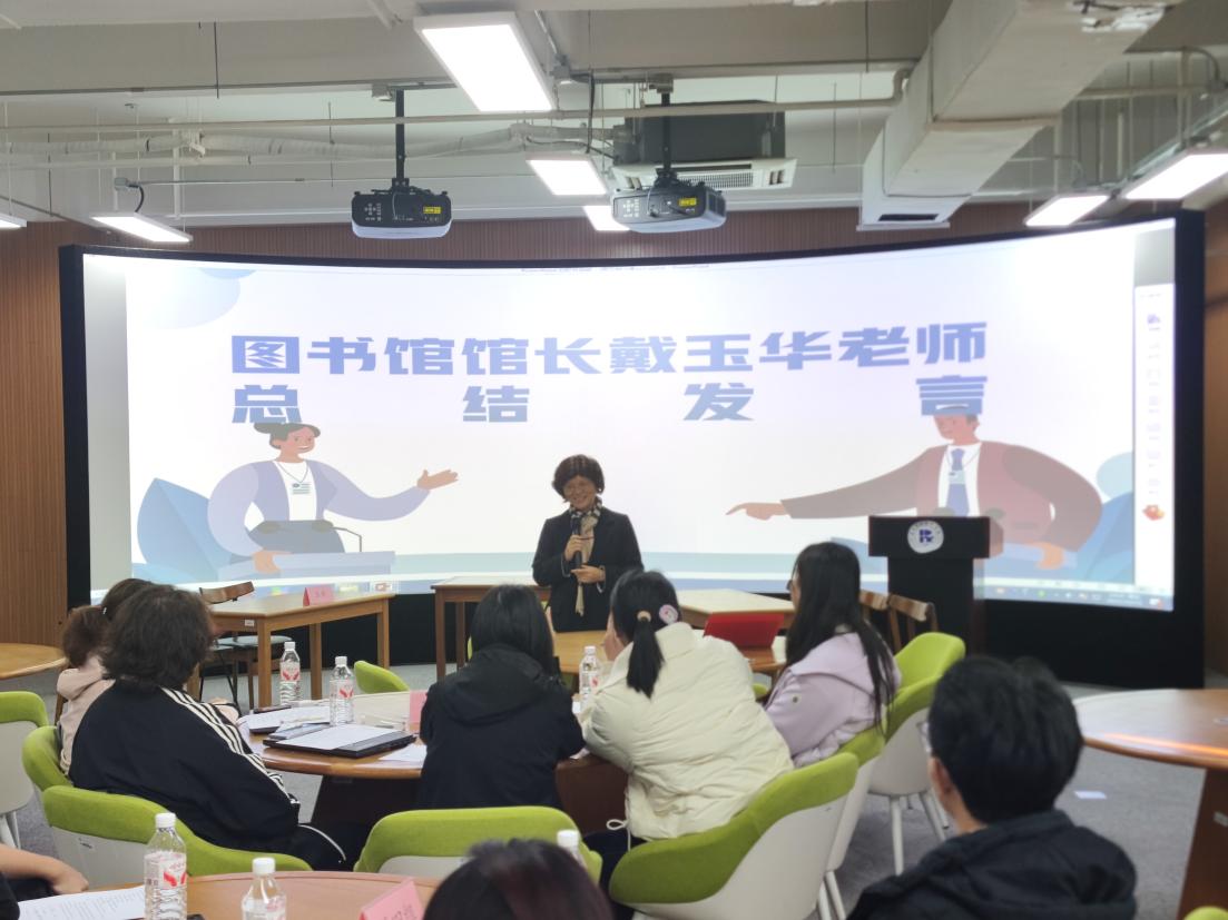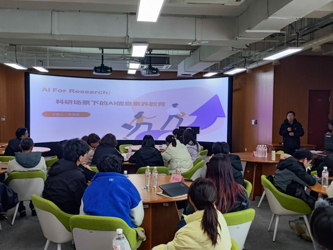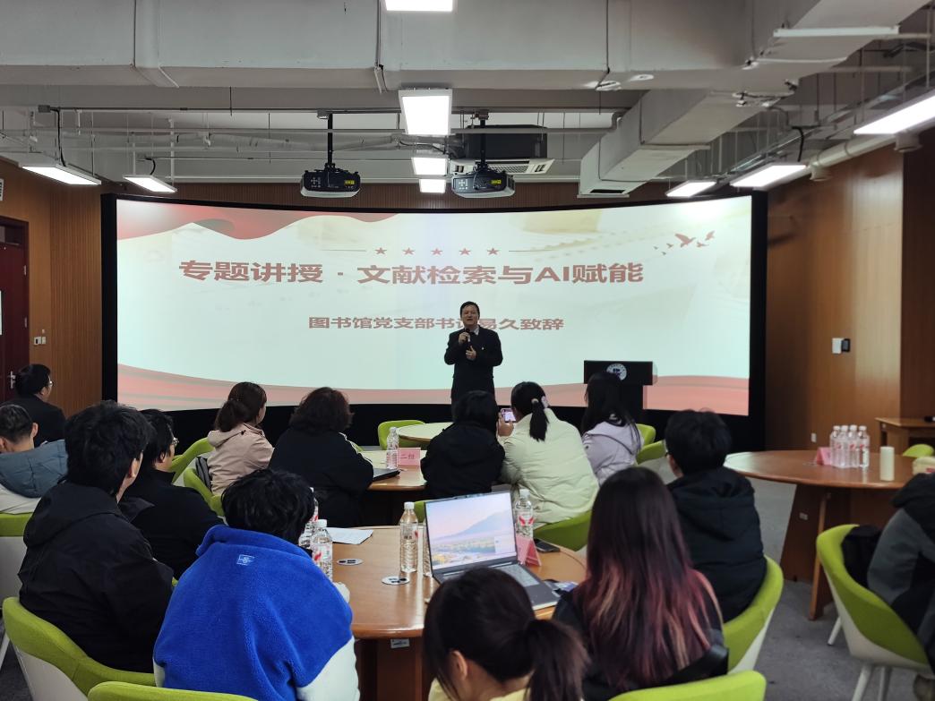 在专题讲授环节,图书馆资源建设中心主任王浩成老师围绕“科研场景下的AI信息素养教育”展开深入讲解,系统介绍了核心数据库的使用方法、关键检索策略及AI工具在科研过程中的应用与风险,帮助大家提升信息素养与智能工具使用能力。随后的互动环节中,同学们踊跃提问,气氛热烈。