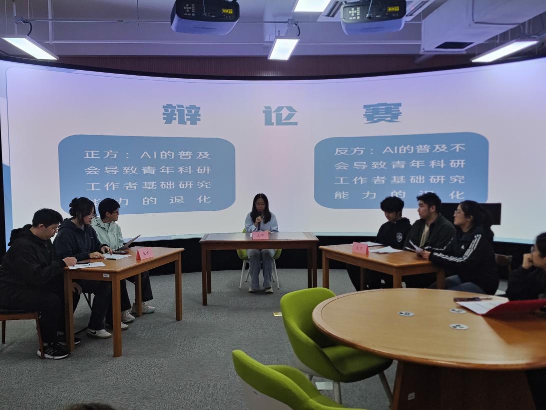 思辨交锋环节由本科生党员围绕“AI的普及会/不会导致青年科研工作者基础研究能力的退化”这一辩题展开激烈辩论。正反双方立足学术本质与技术发展,就AI与科研能力的关系展开了深度思辨,展现了青年党员的逻辑思维与批判意识。图书馆馆长戴玉华老师在总结中指出,AI技术既是机遇也是挑战,关键在于青年科研工作者要保持学术定力,善用而不依赖,让AI成为推动科研创新的有效工具。
