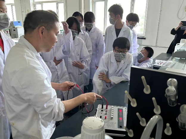 模块二是与北京八中大兴分校对接,邀请北京八中大兴分校师生来校观摩化学实验竞赛。支部书记林世静首先向北京八中大兴分校的师生们简单介绍了北京市大学生化学实验竞赛以及近年来我校参赛的相关情况。在新材料与化工学院学生第六党支部学生志愿者的引导下,北京八中大兴分校的师生深入实验室,近距离观摩了大学生化学实验实操竞赛。支部党员易玉峰老师引导北京八中大兴分校的师生参观了化学化工国家级实验教学示范中心的物理化学实验室和化工原理实验室,并指导北京八中大兴分校的师生们在物理化学实验室亲自动手开展了原电池的制备及电动势测定的实验,开阔了中学生的视野,得到了北京八中大兴分校师生的好评。