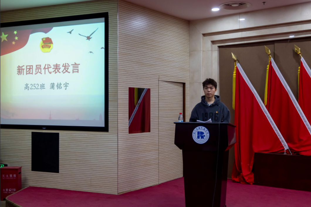 新团员代表高252班班长蒲铭宇同学发言。他表示,能加入共青团倍感光荣与自豪,这既是荣誉更是沉甸甸的责任。未来将牢记入团誓词,作为新团员,作为班长,会牢记初心使命,不负团组织的培养,不负老师和同学们的信任,以更饱满的热情、更务实的行动,带领班级共同进步,努力向党组织靠拢,让青春在为祖国、为人民的奉献中焕发出绚丽光彩!