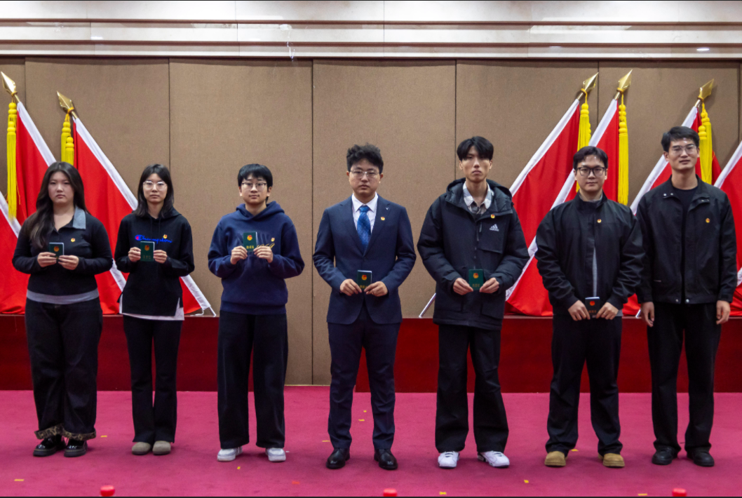 团委书记杨哲老师为新发展团员颁发团员证,佩戴团徽。