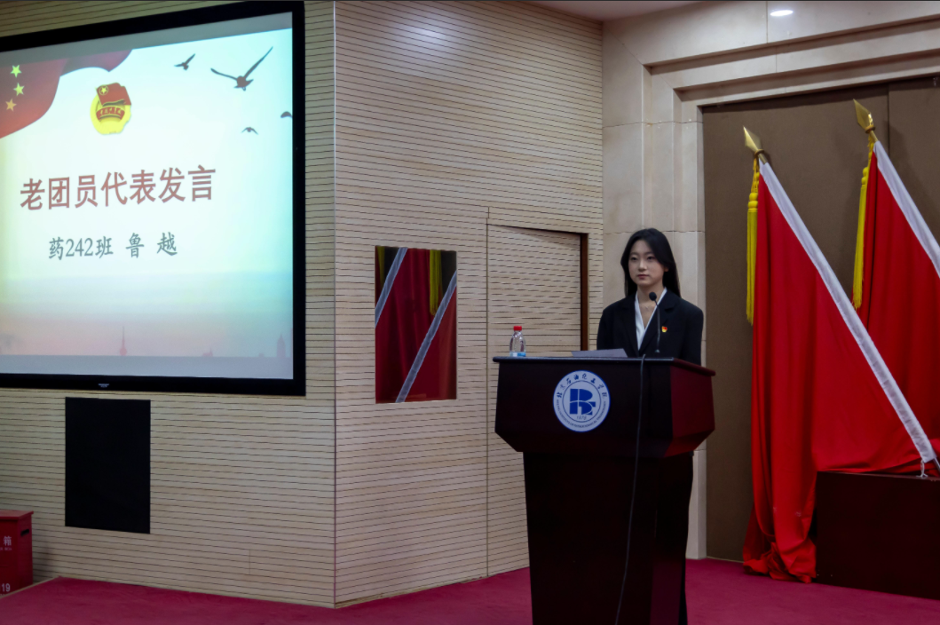 老团员代表学生第五党支部预备党员、药242团支部书记鲁越同学发言。她分享了自己从入团到入党的心路历程,并寄语新团员们,要始终以团徽为精神标识、以入团誓词为行动指引,在校园里坚定理想信念、在学习中锤炼过硬本领,主动在各类实践活动中勇当先锋、敢挑重担,用脚踏实地的实干为团旗增辉添彩,在强国建设、民族复兴的壮阔征程中书写属于青年的青春华章。