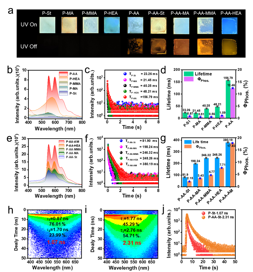 图3:选择不同质子供体能力单体,验证质子转移氢键在调控室温磷光中的重要性。a. 仅含AA的均聚物P-AA有黄色余辉,St/MA/MMA/HEA均聚物无余辉,而这些单体与AA的共聚物均出现明亮黄色余辉;b-d. P-AA的磷光强度、寿命(156.79ms)和量子产率(12.46%)远高于其他均聚物;e-g. 共聚物的磷光性能较对应均聚物显著提升,证实PTHBs对RTP的调控作用;h-j. P-AA-St的激发态寿命长于P-St,证明PTHBs有效抑制了S₁非辐射弛豫。