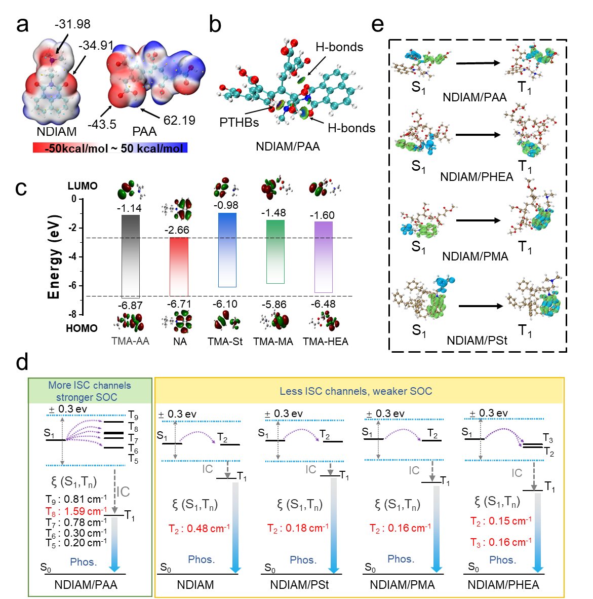 图4:理论模拟计算验证质子转移氢键在阻断光诱导电子转移、促进系间窜越起到关键作用。a. NDIAM的叔胺和羧基之间存在强分子间相互作用;b. NDIAM/PAA间以吸引作用和范德华力为主,且羧基与叔胺形成PTHBs、羧基与羰基形成分子间氢键;c. HOMO-LUMO能级分析表明,AA可通过PTHBs改变叔胺的能级分布,抑制PET效应引发的S₁非辐射弛豫,而St/MA/HEA无此作用;d. NDIAM/PAA在S₁能级±0.3eV范围内有更多ISC通道且SOC常数更大,显著促进ISC;e. NDIAM/PAA中S₁和T₁态的空穴和电子转移至PAA,发生电荷转移,促进ISC并降低非辐射弛豫常数,延长磷光寿命。