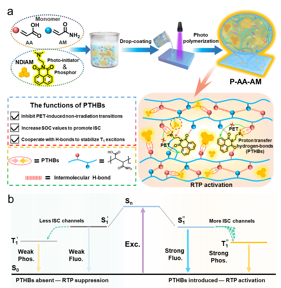 图1. 萘酰亚胺光固化RTP材料的制备过程及其调控机制示意图。