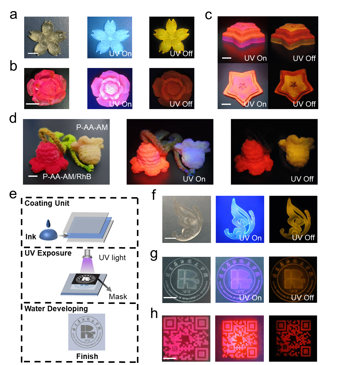 图6:三维立体成型和光刻图案化。a-c. 逐层光固化制备的黄色、红色及黄红双色3D块状RTP材料;d. P-AA-AM和P-AA-AM/RhB处理的棉线,紫外光下为蓝色荧光和橙红色荧光,关灯后分别呈现黄、红余辉;e图为光图案化的工艺流程:涂覆墨水→掩膜紫外曝光→水显影;f-h.在PVC、玻璃等不同基底上制备出蝴蝶、校徽、二维码等图案。标尺:8毫米。