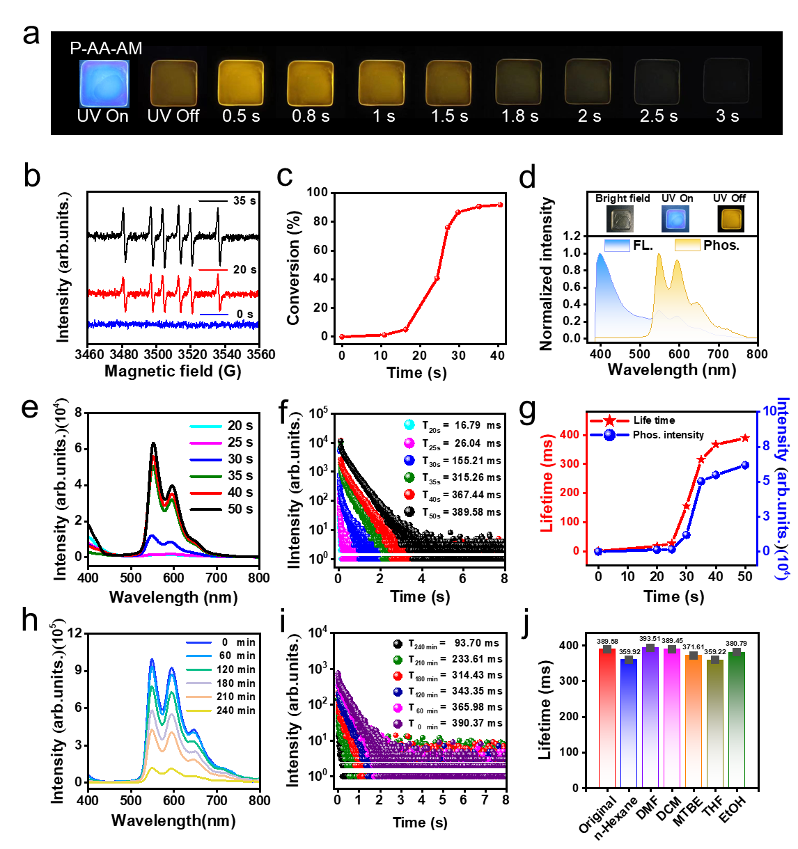 图2:光固化RTP的光学性能测试。 a. P-AA-AM薄膜的余辉照片;b. 紫外光照射下NDIAM产生自由基;c. 光固化40 s后双键转化率达~91.80 %;d-g. 随光固化时间延长,P-AA-AM的RTP强度和寿命显著提升,50s时寿命达389.58ms;h, i. 材料在水中浸泡210min仍保持良好RTP性能;j. 在n-Hexane、DMF、DCM等多种有机溶剂中浸泡45天,RTP寿命和强度无明显变化,证实其优异的耐溶剂性。