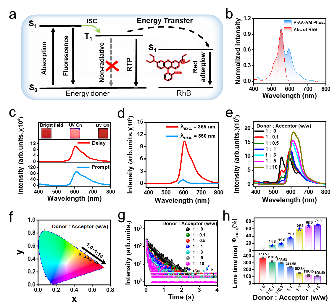 图5. 利用磷光共振能量转移原理,实现余辉颜色从黄色到红色的连续调控。 a. TS-FRET过程示意图,P-AA-AM作为能量供体,RhB作为能量受体;b. P-AA-AM的磷光光谱与RhB的吸收光谱高度重叠;c-d. P-AA-AM/RhB存在高效的TS-FRET过程,间接激发下有强延迟发射,直接激发下RhB无明显延迟发射;e-g. 随RhB负载量增加,P-AA-AM的550nm延迟光谱强度逐渐减弱直至消失,发射峰红移至614 nm,余辉从黄色变为红色,且磷光寿命从373.50ms降至108.40ms;h. TS-FRET效率随RhB负载量增加逐渐提升至71.0%。