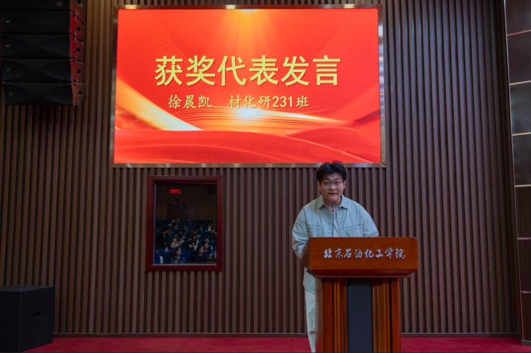 研究生获奖代表、材化研 231 班徐晨凯同学结合七年求学与三年科研历程,分享了科研路上的体会与思考。他鼓励同学们主动学习、勤能补拙,从基础小事做起,耐住孤独、深耕钻研;要对科研保持敬畏与热情,严谨对待每一个实验细节;同时建议大家带着方案请教问题,善用AI工具但坚守独立思考,以“路漫漫其修远兮,吾将上下而求索”的精神砥砺前行。