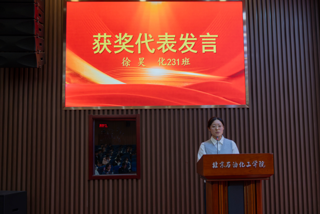 本科生获奖代表、化 231 班徐昊同学结合自身经历,从勤学立身、服务担当、科研突破三个方面分享成长心得。她表示,作为学生始终以学习为本,脚踏实地、笃行致远;在学生工作中坚守服务初心,在奉献中锤炼本领;在科研竞赛中勇于挑战、突破自我,以实际行动诠释新时代青年的责任与担当,号召全体同学珍惜韶华、勤奋逐梦。