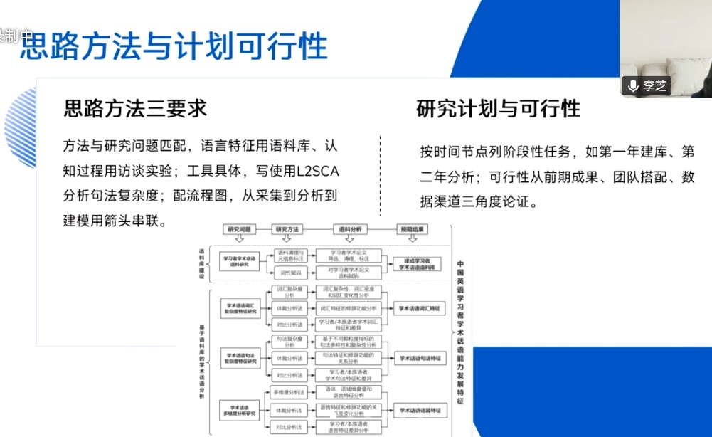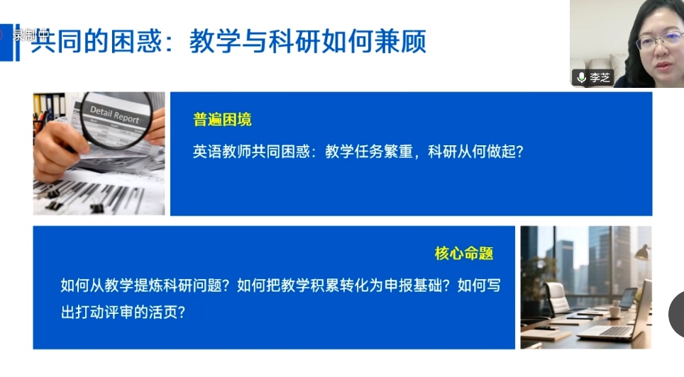 李芝教授结合申报和主持教育部人文社科基金和国家社科基金的切身体会和丰富经验,基于英语教师教研实际,分享实操技巧与教研融合路径。讲座开篇提出“教学困惑+系统方法+持续积累+主动申报=学术成长”的核心成长公式,明确教学是科研的天然问题源,学生课堂上的疑问、写作中的痛点都是优质选题;科研是教学的助推器,研究成果能让教学更有底气,实现教研双向赋能。