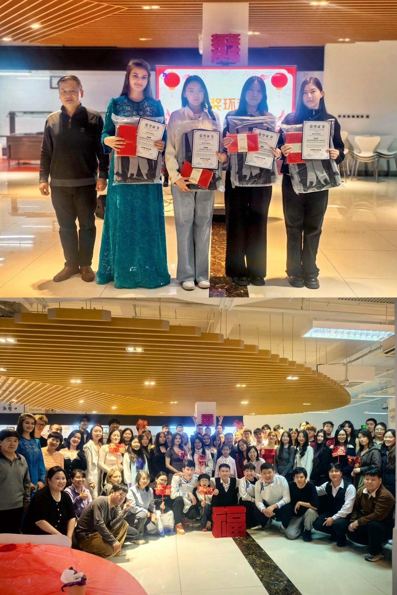 文艺表演如同一幅多彩的文化画卷徐徐展开。俄罗斯布里亚特民族的留学生们献上特色民族舞,铿锵的舞步和独特的韵律仿佛将观众带到了辽阔的贝加尔湖畔。中国学生刘美琦的歌曲演唱《hello》以温柔的旋律串联起不同语言的心灵,而汉语初级二班学子集体演绎的《对面的女孩看过来》则唤起了全场观众的青春共鸣。随着王洋海同学动感十足的即兴舞蹈《let's boogie》登场,晚会气氛被推向高潮,灵动的舞步展现了青春的活力与朝气。同学们在联欢会中还进行了抽奖、玩猜字游戏。最后,一曲优美的华尔兹缓缓上演,轻盈旋律与优雅姿态交织,恰似中外学子跨越山海的绵长情谊,尽显文化交融之韵。师生们在欢乐中迎接了一个喜庆的新年。