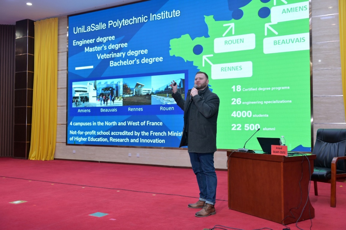 12月5日,法国亚眠拉萨尔大学科研负责人Arnaud DUJANY-COUTU博士做客我校致远创新讲堂,为我校近200名教师、研究生做了一场题目为“数字仿生学作为未来新的操作工具”的英语学术讲座。国际合作与交流处黄建平处长主持讲座。