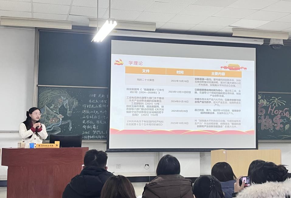 本期“工研论坛”聚焦三大环节。第一环节是“学理论”,杨荣荣同学以《以创新驱动发展:产业变革与财会新视野》为题,紧密结合党的二十届四中全会精神与“十四五”规划建议,为在场同学带来了一场内容充实、视野开阔的理论学习课。她首先系统梳理了全会公报的核心要点,强调在当前新一轮科技革命浪潮中,大数据、人工智能、工业互联网等不仅是技术工具,更是驱动产业体系重构、企业形态变革的根本力量。