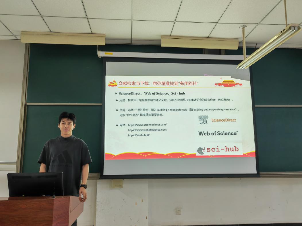 论坛第二环节“练本领”由审研231骆士杰主讲科研工具的应用。基于论文撰写过程中的文献检索、文献管理、文献综述、数据分析和流程图制作流程五大环节,对科研工具进行分类讲解。文献检索方面,系统演示运用中国知网、Web of Science和图书馆工具进行学术论文下载的流程,总结期刊分类、影响因子等信息查询方法。文献管理方面,分享Zotero、NoteExpress两种工具的下载网址和使用方法。文献综述方面,集中于青泥学术和Paper Digest在文献梳理方面的应用。数据分析方面,分别讲解SPSS在审计问卷小样本数据统计的应用,Python在海量数据处理、可视化与机器学习方面的优势,以及Stata统计功能专业、语法简洁的特点。科研工具种类丰富、特点鲜明、分类明确、使用方法清晰,为开展科研学习提供有效参考。