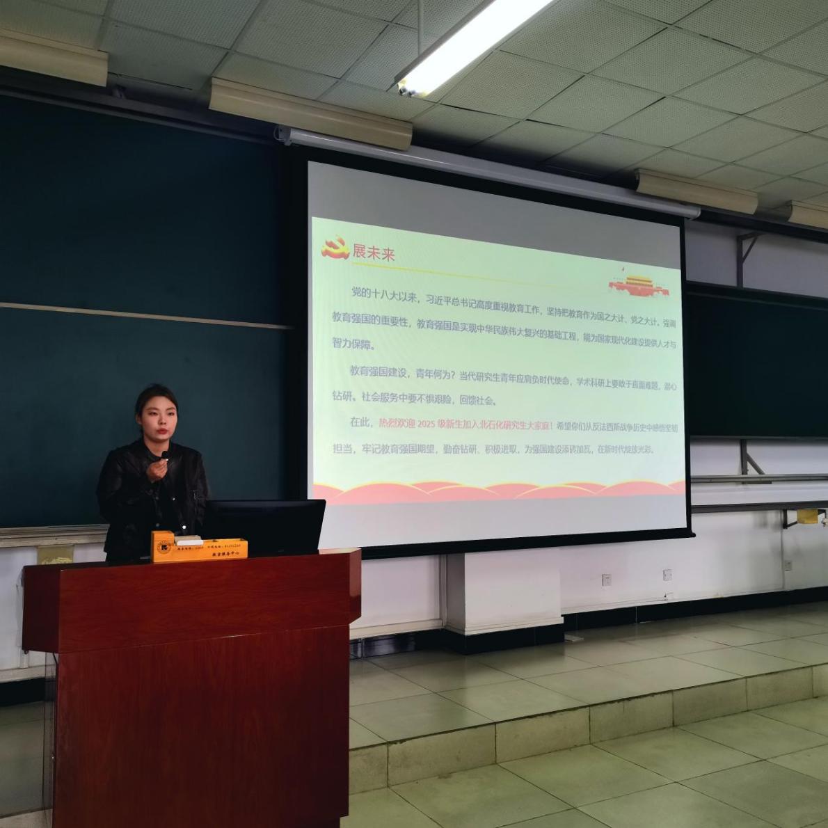 以胜利之昭,明治学之向。论坛第三环节“展未来”由审研241康泽璇主讲。以习近平总书记建设教育强国理念为指导,提出叩响心门的关键一问“教育强国建设,青年何为?”,引发大家深入思考。康泽璇同学据此给出“当代研究生青年应肩负时代使命,潜心钻研学术问题,积极参与社会服务”的关键性解答,激励大家在反法西斯战争历史中感悟坚韧担当,牢记教育强国期望,为强国建设贡献自己的一份力量。