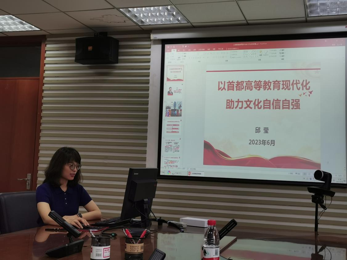 6月20日,邱莹副院长以《以首都高等教育现代化助力文化自信自强》为题给基层教学组织负责人教授专题党课。