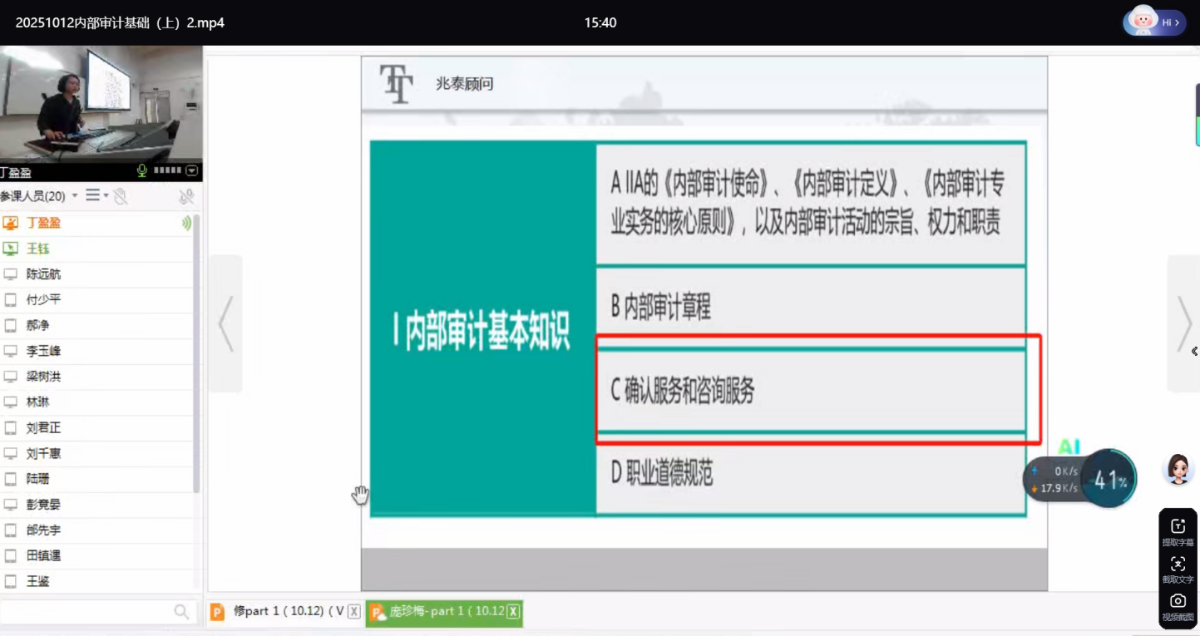 讲座第二部分,庞珍梅老师重点讲解了内部审计的独立性与客观性。庞老师结合实务案例,列举了损害独立性的具体情形,并介绍了审计机构通过多种方式保持客观性的政策措施。最后,庞老师还围绕内部审计人员的胜任能力要求展开论述,强调审计人员需具备审计、财务、风险管理等多领域专业知识,同时要保持应有的职业审慎,并通过持续专业发展更新知识体系,以适应内部审计行业的发展需求。