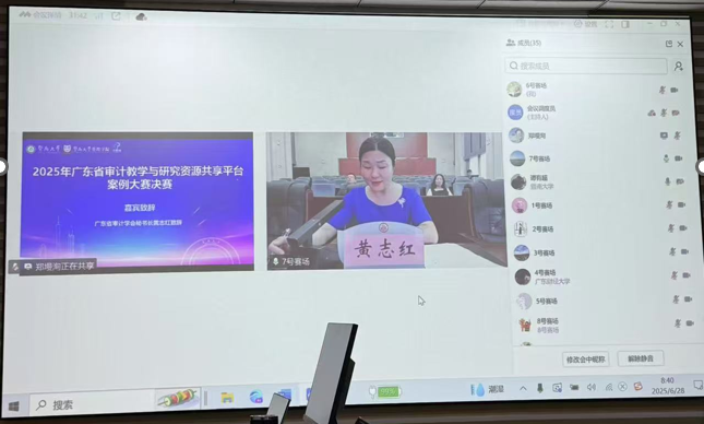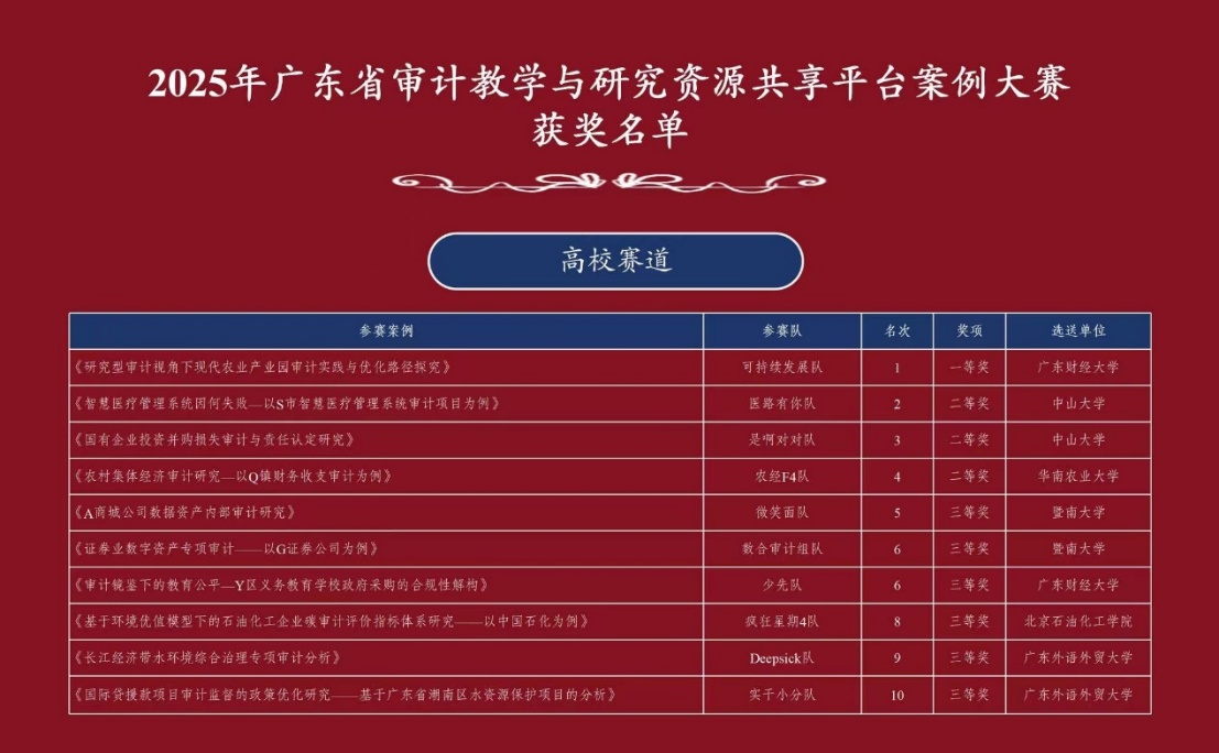 2025年6月28日,广东省审计教学与研究资源共享平台案例大赛决赛在暨南大学圆满落幕。由我校经济管理学院教师杨琳、杨大飞指导,审计专硕学生康泽璇、朱梦淋、唐雨盈和李忠霖组成的“疯狂星期4”队在本次案例大赛中,通过深入的理论分析、创新的解决方案及严谨的数据验证,完成高质量案例论文;在线上演示环节,凭借清晰的逻辑呈现、可视化的PPT表达,最终荣获高校组三等奖。